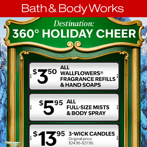 Find $3.50 Wallflowers fragrance refills and hand soaps, $5.95 full-size mists and body sprays, and $13.95 3-wick candles this weekend at Bath & Body Works!
