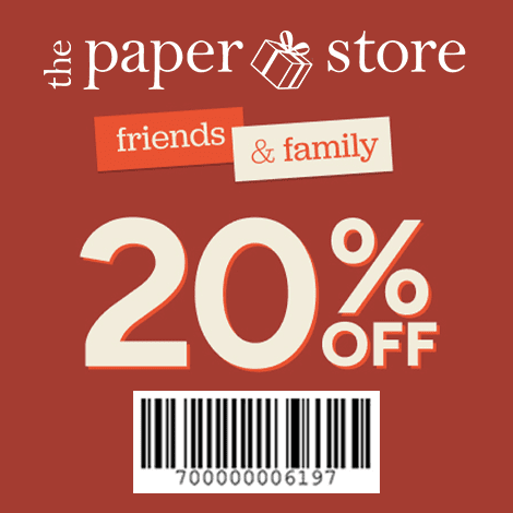Take 20% off your entire purchase during The Paper Store’s Friends & Family Event! Valid w/ coupon!
